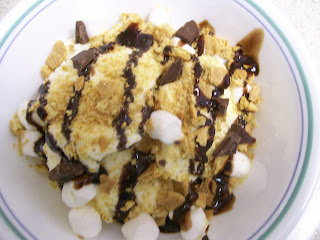 To make one sundae, I used 3-4 scoops of ice cream, 10-15 marshmallows, 1/2 hershey bar (chopped), 1 or 2 graham crackers (crushed), and then I topped it with Hershey's chocolate.